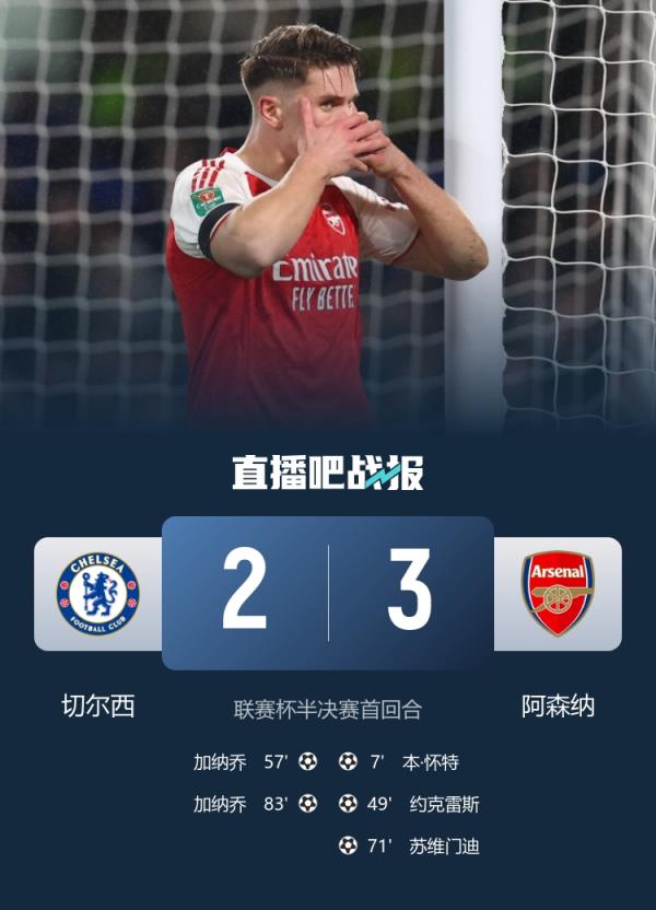 联赛杯-阿森纳3-2切尔西占得先机 本怀特约克雷斯破门加纳乔双响